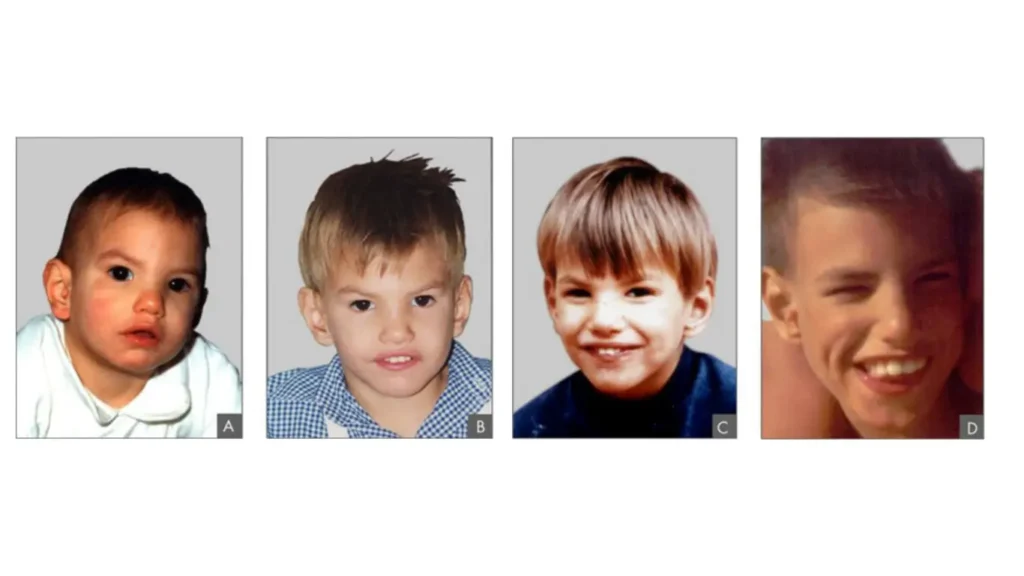 Araştırma sonuçlarına göre belirtiler sırasıyla en sık görülenden en aza doğru sıralandığında düşük kas tonusu (Ing. hypotonia) yani kasların harekete karşı koyduğu direncin azalması ilk sırayı almaktadır. Devamında ise geç gelişim, özgün bir ağlama, küçük kafalılık (mikrosefali) vb. belirtiler gelmektedir. [3] Yüzde ise hipertelorizm1, burun köprüsünün geniş olması, göz çevresindeki deri kıvrımları, alt ve üst göz kapağı arasındaki boşluğun aşağıya eğilmesi, kulakların aşağıda olması ve çenenin geride olmasını ifade eden retromikrognati2 gibi çeşitli farklılıklar gözlemlenmektedir [4].
